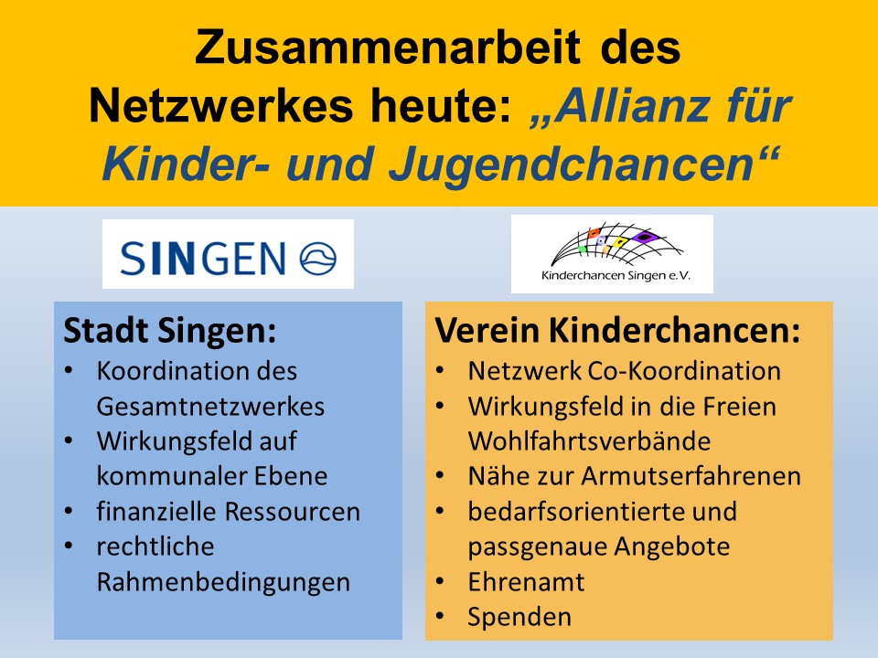2017 wurde das Netzwerk Kinderchancen an die Stadt Singen übertragen, um das Thema Kinder- und Jugendarmut dauerhaft in den kommunalpolitischen Fokus zu rücken. Heute koordinieren wir gemeinsam mit der städtischen Koordinationsstelle gegen Kinder- und Jugendarmut und der Stadtverwaltung das umbenannte Gesamtnetzwerk „Allianz für Kinder- und Jugendchancen“ – partnerschaftlich, auf Augenhöhe und mit den Stärken aller Beteiligten.