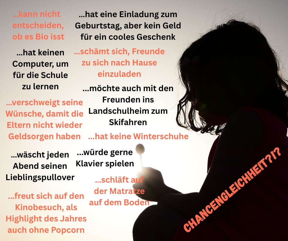 Kinder in Armut haben oft weniger Zugang zu Freizeitangeboten, Nachhilfe oder kultureller Bildung. Schon im Kindergarten zeigt sich, wer Dinge wie Turnschuhe, Matschhosen oder Gummistiefel nicht hat – nicht aus mangelndem Willen, sondern aus fehlenden Mitteln. In der Schule fehlen dann Hefte, ein eigener Schreibtisch oder ein Laptop. Wiederholte kleine Misserfolge erzeugen Hilflosigkeit, Isolation und eingeschränkte Lebensperspektiven.