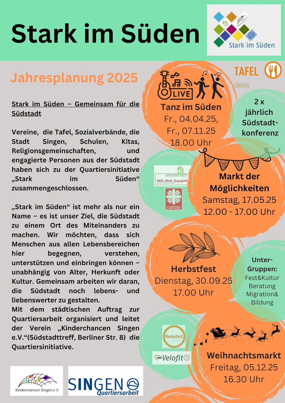 Vereine, die Tafel, Sozialverbände, die Stadt Singen, Schulen, Kitas, Religionsgemeinschaften und engagierte Personen aus der Südstadt haben sich zur Quartiersinitiative „Stark im Süden“ zusammengeschlossen.